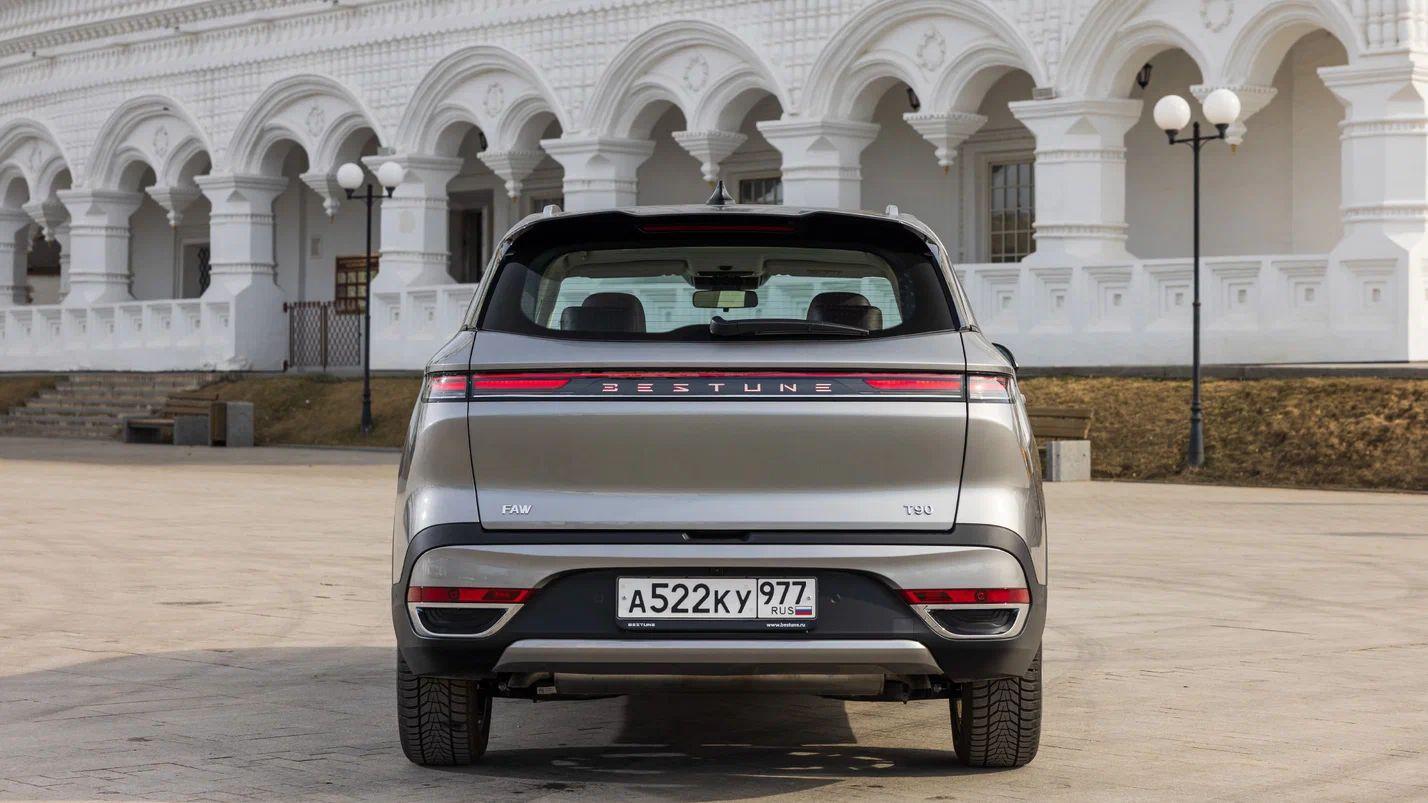 Сзади индивидуальности на первый взгляд поменьше, но упрекнуть экстерьерщиков в копировании чужих идей сложно. Крупное название бренда стало частью светотехники, изгибы и линии довольно самобытны, декоративные патрубки выпуска не портят картину. И лишь стрелки, идущие наискось от стоек крыши к низу передних дверей и по задумке символизирующие натянутую тетиву лука, немного теряются в районе задних крыльев — это особенно заметно при взгляде на кроссовер в три четверти спереди. При этом замысловатая линия талии устраняет визуальную припухлость кузова, а «двойные» арки — ободок тёмного пластика плюс дуга-кант на крыльях — визуально делают даже базовые 18-дюймовые колёса с покрышками 225/60 чуть крупнее, чем они есть на самом деле. В топе у Bestune — диски на дюйм больше, с контрастной чёрной подложкой.