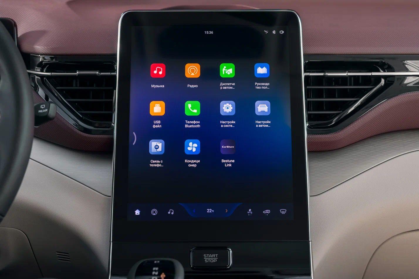 12,6-дюймовый инфокомплекс с наклонённым дисплеем выглядит стильно, хотя и не очень оригинально. Но недостаток медийки Bestune вовсе не в дизайне: угол наклона глянцевой панели сделал её бликующей, а нажатия на иконки экрана далеко не всегда дают ожидаемый отклик. При этом электронный комплекс автомобиля добротно русифицирован (лингвистические шероховатости и ошибки немногочисленны), картинка с камер панорамного обзора приличная, а протоколы Apple CarPlay и Android Auto позволяют без «костылей» сдружить машину и смартфон.