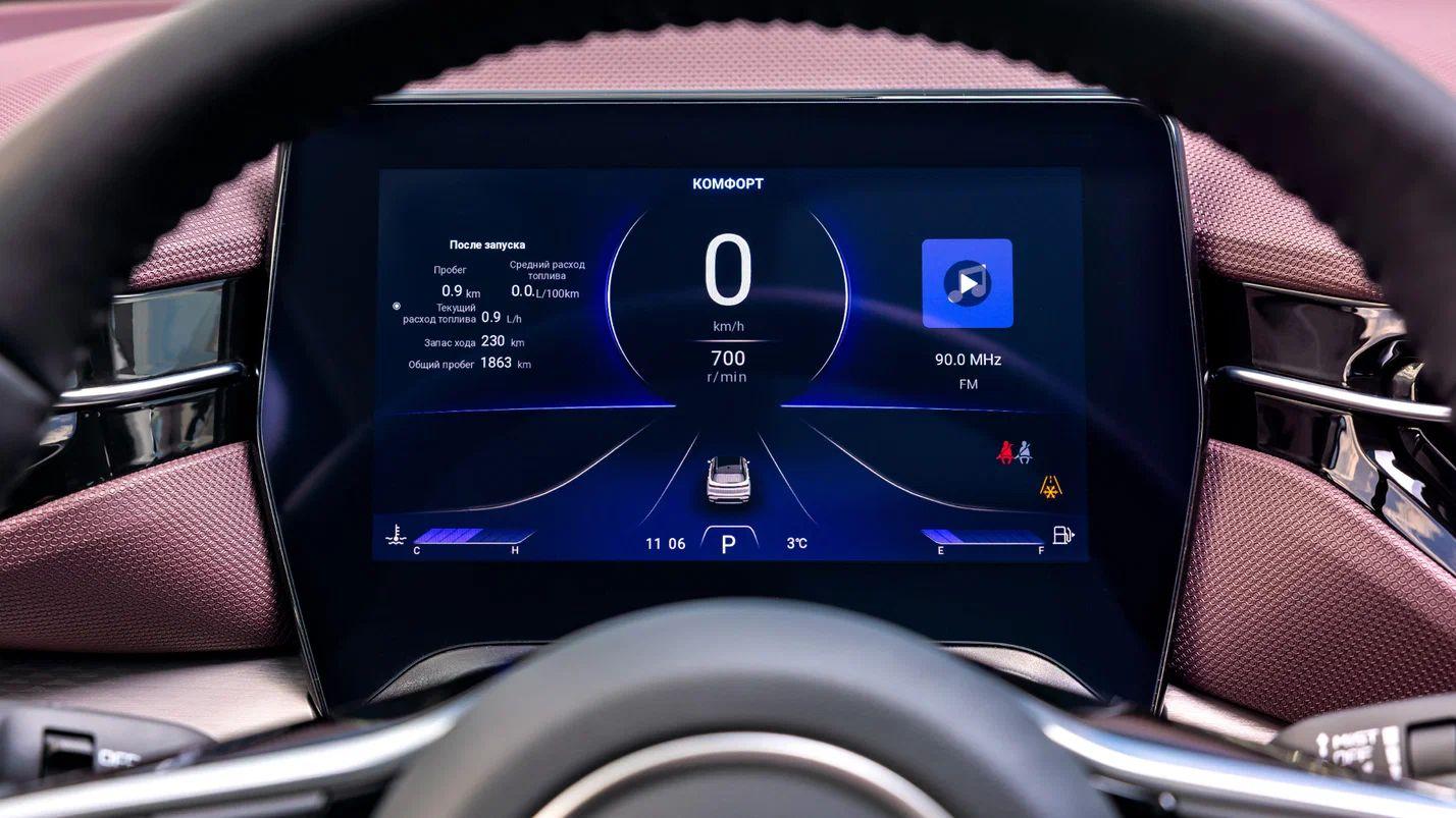 Приборка T90 — утопленный в панель почти квадратный цветной экран, показания которого не перекрываются рулевым ободом. И пусть имитация стрелочных спидометра с тахометром в меню щитка отсутствует, считывать данные, контролируя темп езды, легко. Вдобавок скорость выводится проекцией на ветровое стекло — туда же можно «дослать» подсказки ассистента полосы, сделав виртуальный кластер более информативным. Правда, перед этим нужно освоиться с меню центрального дисплея: найти нужный раздел и отыскать требуемые настройки.